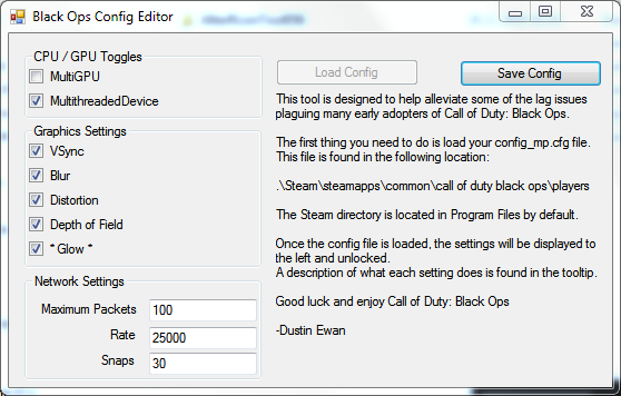 Mit diesem Config Editor hab ich meine Lags und Spielabstürze vollkommen beseitigt. Auf dem Sceenshot seht ihr meine Einstellungen. Wenn ihr eine Grafikkarte mit mehren GPU´s oder mehr als eine Grafikkarte verwendet, macht ein Häckchen bei MultiGPU. Bei MultithreadedDevice könnt ihr sofern euer PC nicht sehr alt ist auch ein Häckchen machen. Bei den Grafiksettings müsst ihr halt herum probieren, aber die Networksettings auf alle Fälle so lassen.